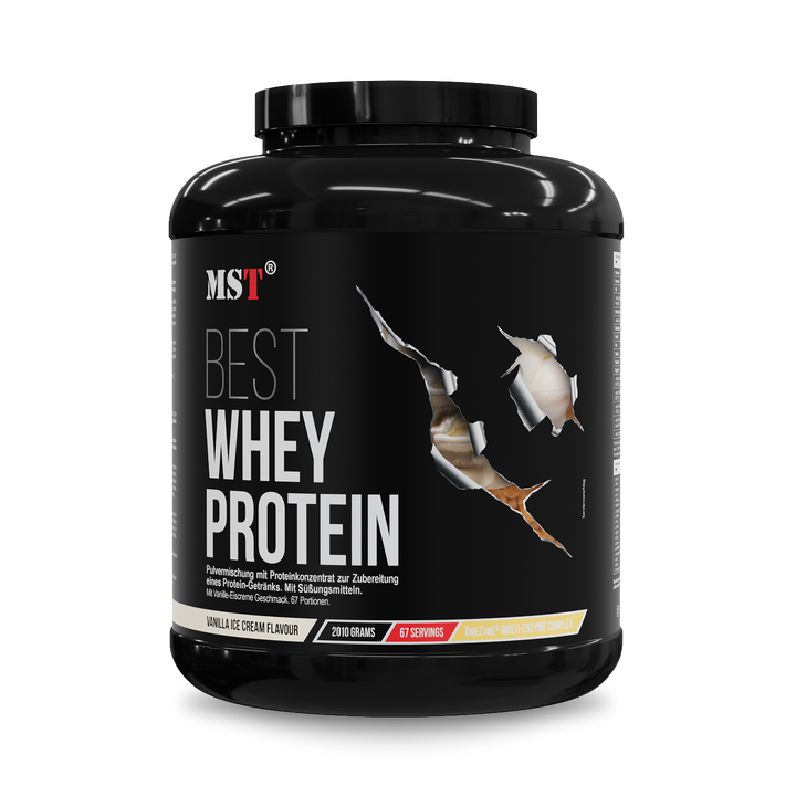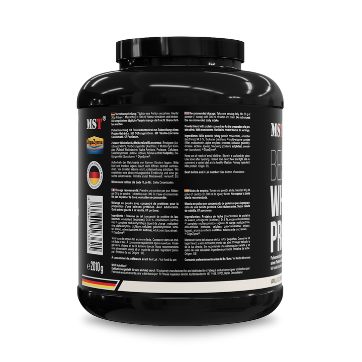 Objevte dokonalý proteinový zážitek s MST® BEST Whey Protein Vanilla Ice Cream 2010 g, doplněným o DigeZyme® - osvěžující kombinaci, která dodá vašemu tělu vysoce kvalitní protein a trávicí enzymy.