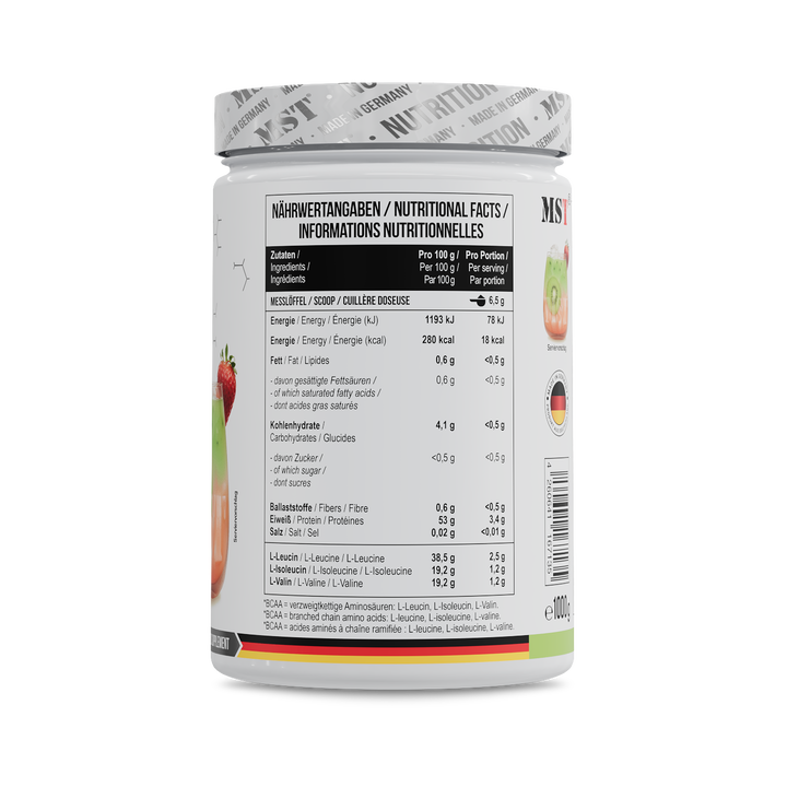 BCAA Zero von MST Nutrition liefert essentielle Aminosäuren im optimalen 2:1:1 Verhältnis aus L-Leucin, L-Isoleucin und L-Valin. Diese verzweigtkettigen Aminosäuren sind wichtige Bausteine von Proteinen, die zum Erhalt und Aufbau von Muskelmasse beitragen können – besonders bei intensiven...