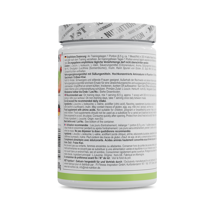 L-Leucin 38,5 %, L-Isoleucin 19,2 %, L-Valin 19,2 %, Säuerungsmittel (Zitronensäure), Inulin, Aroma, Süßungsmittel (Sucralose), Emulgator (Lecithine [Sonnenblume]).